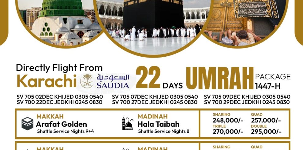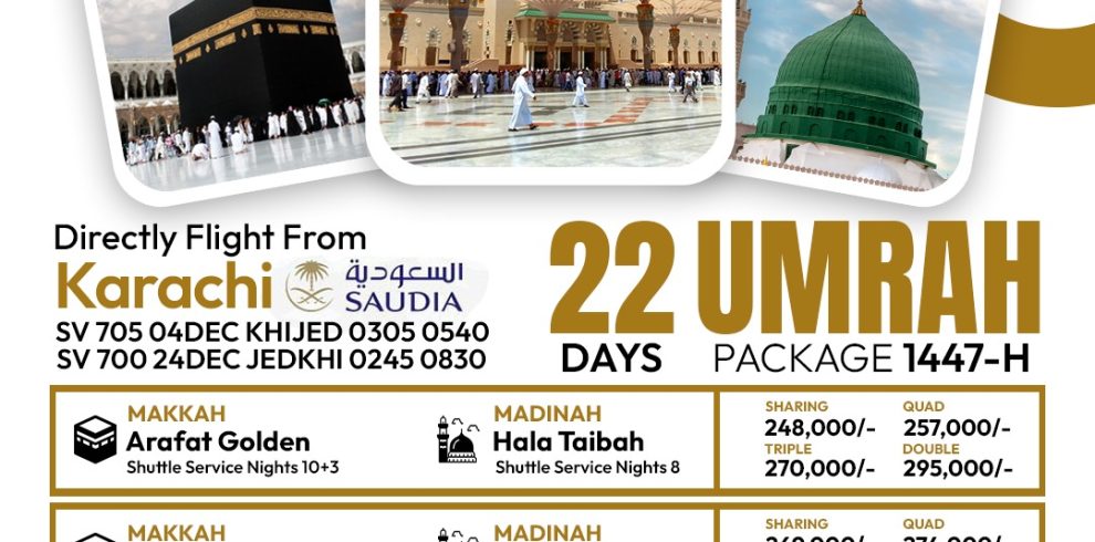 Umrah Package 22 Days 1447-H MAKKAHArafat GoldenShuttle Service Nights 9+4MADDINAHHala TaibahShuttle Service Nights 8Sharing248,000/- PKRTriple270,000/- PKRQuad257,000/- PKRDouble295,000/- PKRMAKKAHQila Ajyad / Kiswar TowerShuttle Service Nights 9+4MADDINAHManazil...