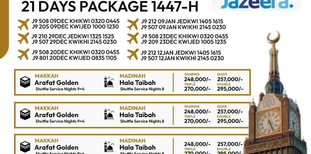 Umarh 21 Days Package 1447-H MAKKAHArafat GoldenShuttle Service Nights 9+4MADDINAHHala TaibahShuttle Service Nights 8Sharing248,000/- PKRTriple270,000/- PKRQuad257,000/- PKRDouble295,000/- PKRMAKKAHArafat GoldenShuttle Service Nights 9+4MADDINAHHala TaibahShuttle Service Nights...